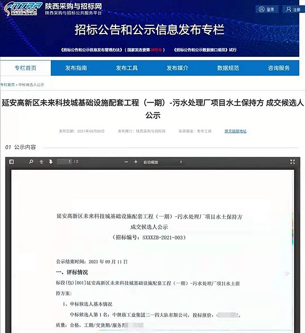 9月8日,通過陜西采購與招標網公示信息獲悉,公司參與競爭性磋商的“延安高新區未來科技城基礎設施配套工程(一期)-污水處理廠項目水土保持方案”,經評標小組專家審定,被確定為第一中標候選人。