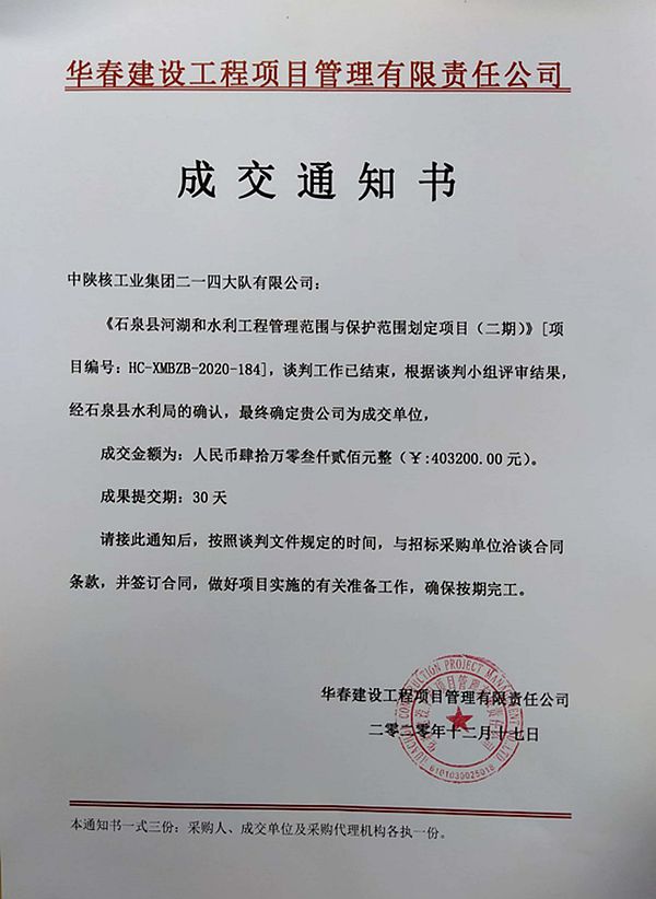 12月18日,從招標(biāo)公司獲悉,公司成功中標(biāo)《石泉縣河湖和水利工程管理范圍保護(hù)范圍劃定》項(xiàng)目。