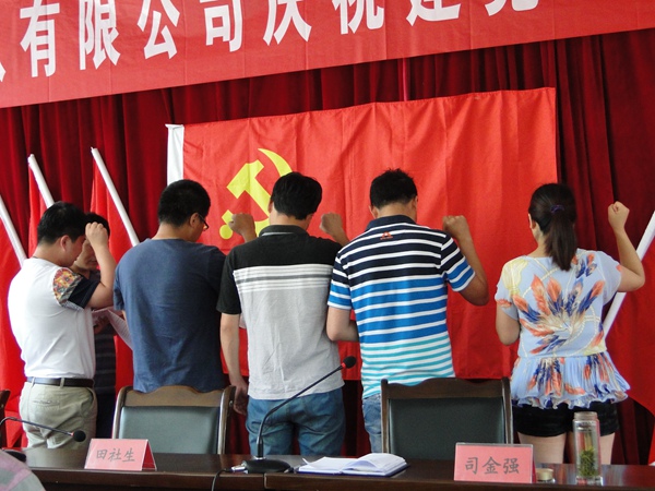 大會舉行了莊嚴的新黨員入黨宣誓儀式,在黨群監審部部長華崢帶領下,新入黨的李陽、魯坤鵬、程芳芳、閆巖、吳小偉五位同志和全體黨員高舉右手,新黨員進行入黨宣誓、老黨員重溫入黨誓詞。新黨員代表李陽做了表態發言。