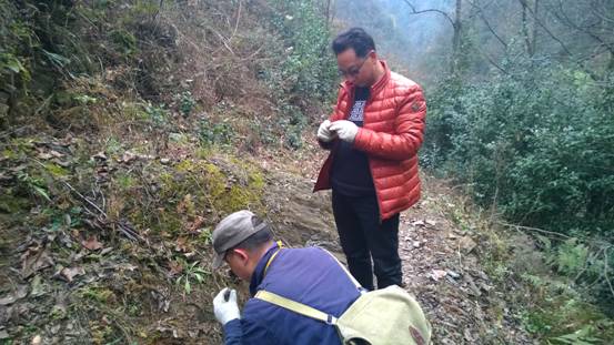 公司總工程師王義忠和總工辦主任涂宏一行,在寧強中壩子項目負責陪同下,從中壩子村移民新區出發,沿著崎嶇的山路,一路翻過5道梁,越過4條溝;穿青岡林,爬茅草坡;穿過幽靜的小溪,爬過羊腸小路的陡峭,身上的衣服濕了又干,干了又濕,歷時4個小時,上到相對高差300米的龍洞渠溝頭的大梁,追索寧強中壩子項目在后期工作中發現的重晶石礦點。