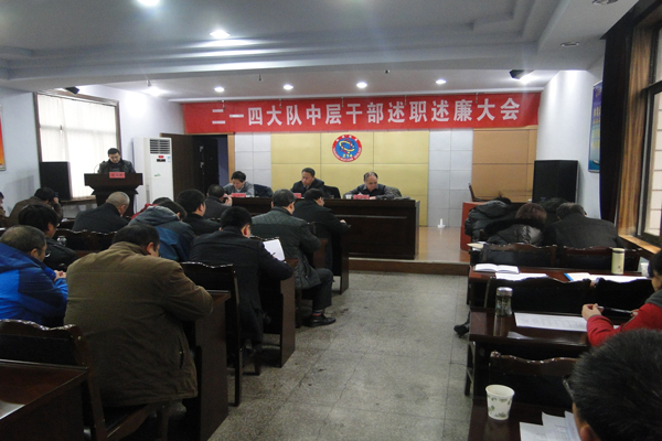為全面了解、掌握大隊中層干部2014年度的工作情況以及在職工中的公認度,進一步加強干部思想作風和工作作風建設,努力打造一支政治堅定、業務過硬、作風過硬的干部隊伍, 2015年1月5日上午,二一四大隊在城固基地三樓會議室舉行了中層干部述職述廉大會。大會由紀委書記楊乃讓同志主持,大隊班子成員、大隊中層干部和機關、經營單位職工共86人參加了此次會議。