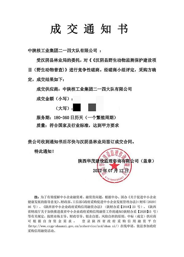 簡訊:公司成功中標漢陰縣野生動物監測保護建設(野生動物普查)項目