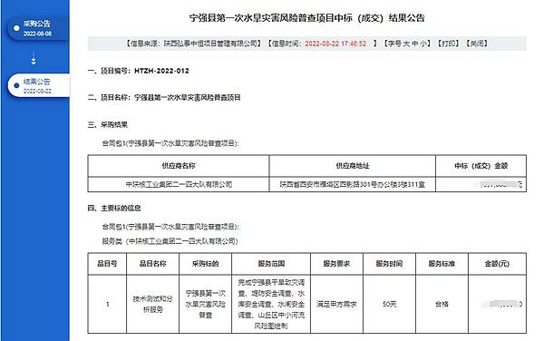 8月22日,從陜西省政府采購網獲悉,公司成功中標《寧強縣第一次水旱災害風險普查項目》。